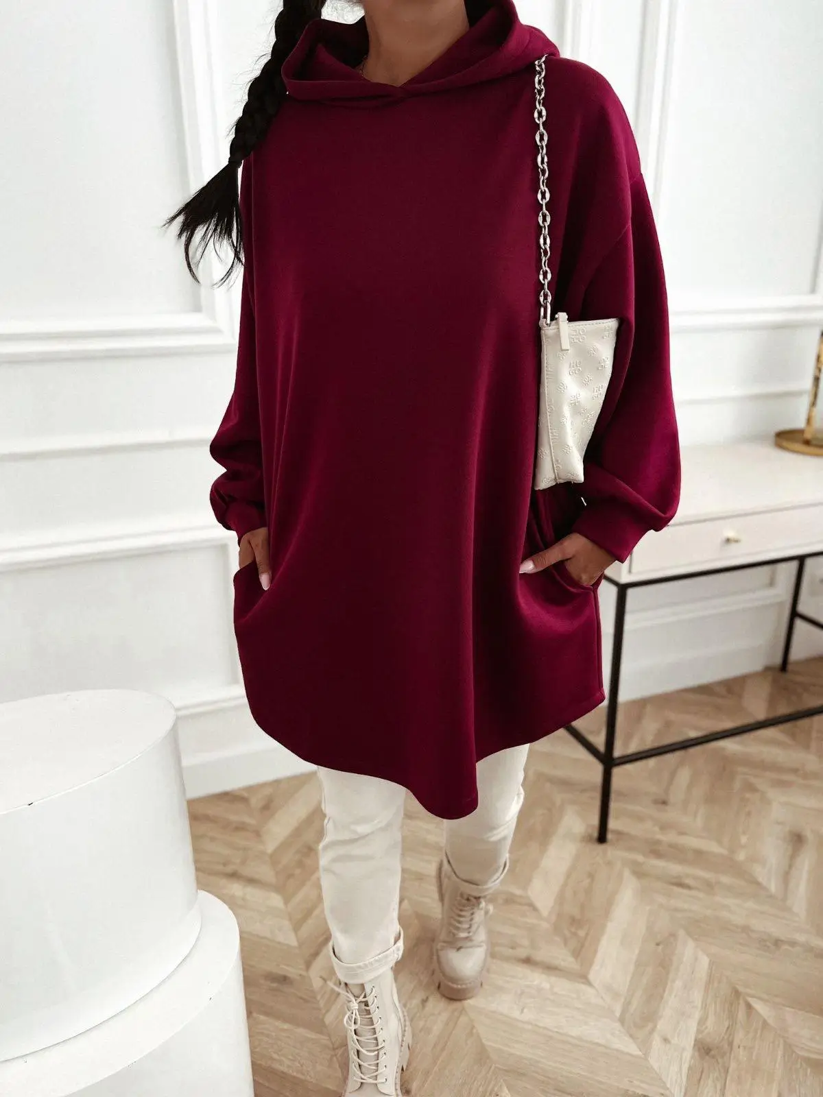 To ta bluza, w której czujesz się swobodnie od rana do wieczora. Przedłużony krój (88 cm) daje efekt tuniki – zakrywa biodra i pupę, dzięki czemu idealnie współgra z legginsami i wąskimi spodniami. Kaptur dodaje sportowego sznytu, a kieszenie w bocznych szwach załatwiają temat drobiazgów i dłoni w chłodniejsze dni.