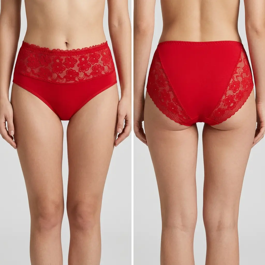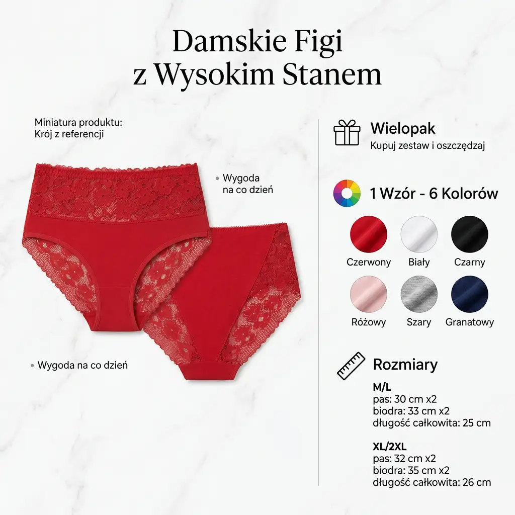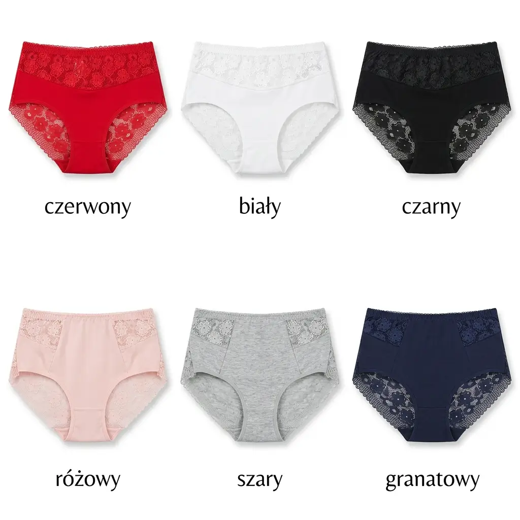 Zestaw 6 damskich fig z koronką w wygodnym, kobiecym fasonie. Model z wyższym stanem, miękkim materiałem i delikatnym koronkowym wykończeniem sprawdzi się idealnie na co dzień.
