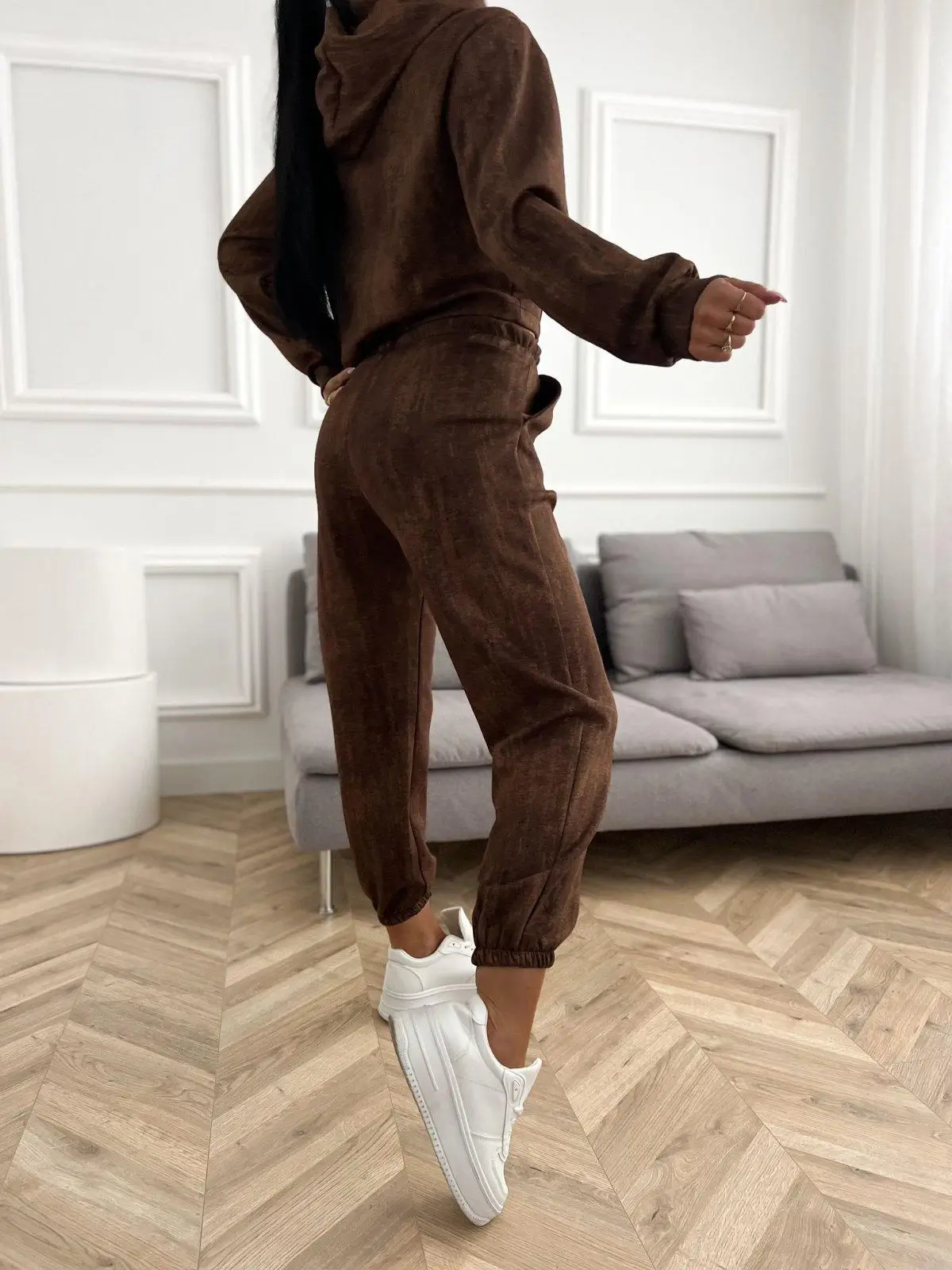 Komplet czekoladowy – joggery z gumą, bluza z kapturemKomplet czekoladowy – joggery z gumą, bluza z kapturem