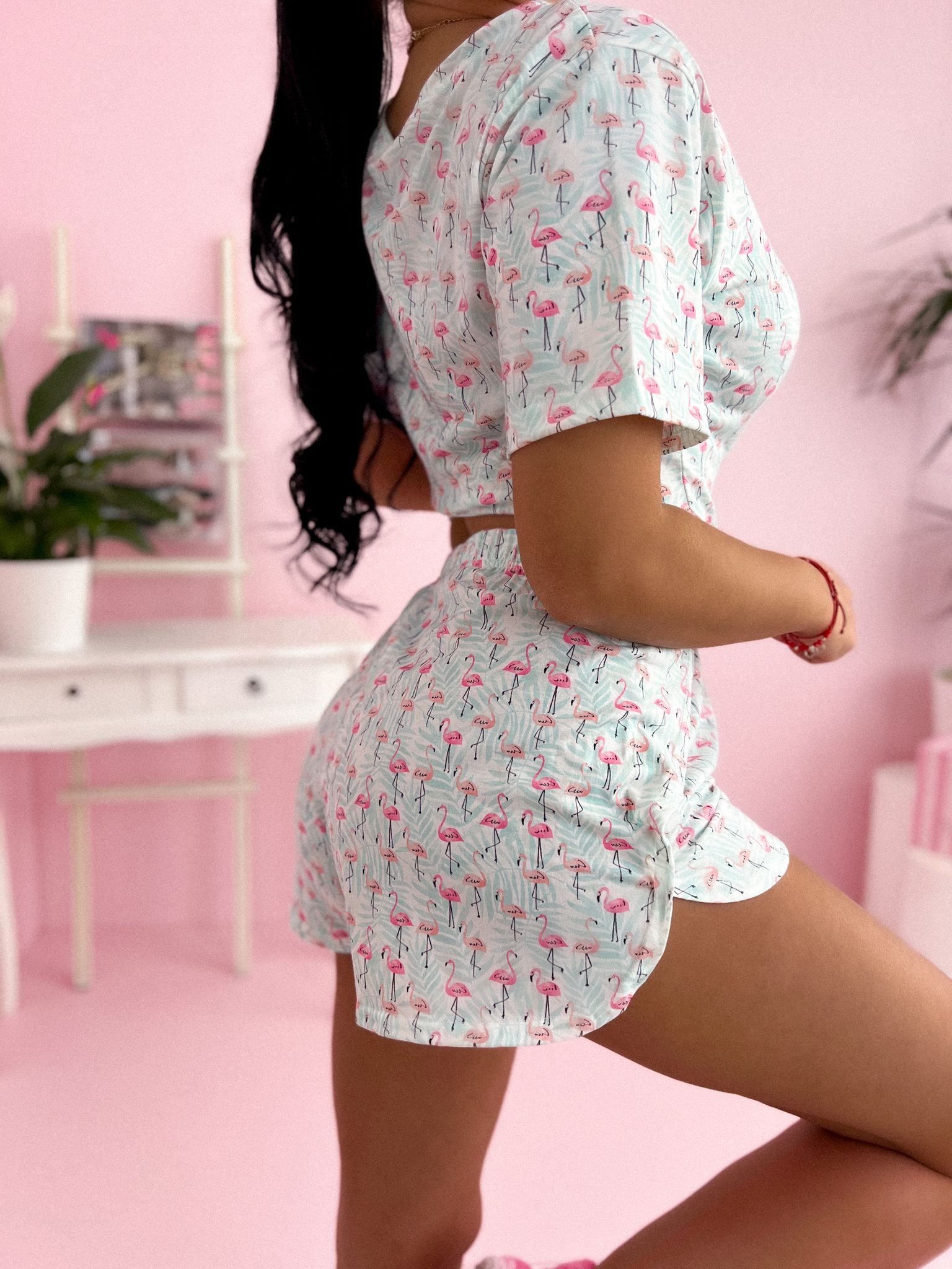 Komplet piżamka damska w rozmiarze uniwersalny, wykonany z przyjemnego w dotyku materiału. Set składa się z bluzki o krótszym kroju z krótkim rękawem oraz spodenek z gumką w pasie oraz rozcięciami na nogawkach. Ten model pokocha każda kobieta. Produkt dostępny w kilku wariantach wzorowych.