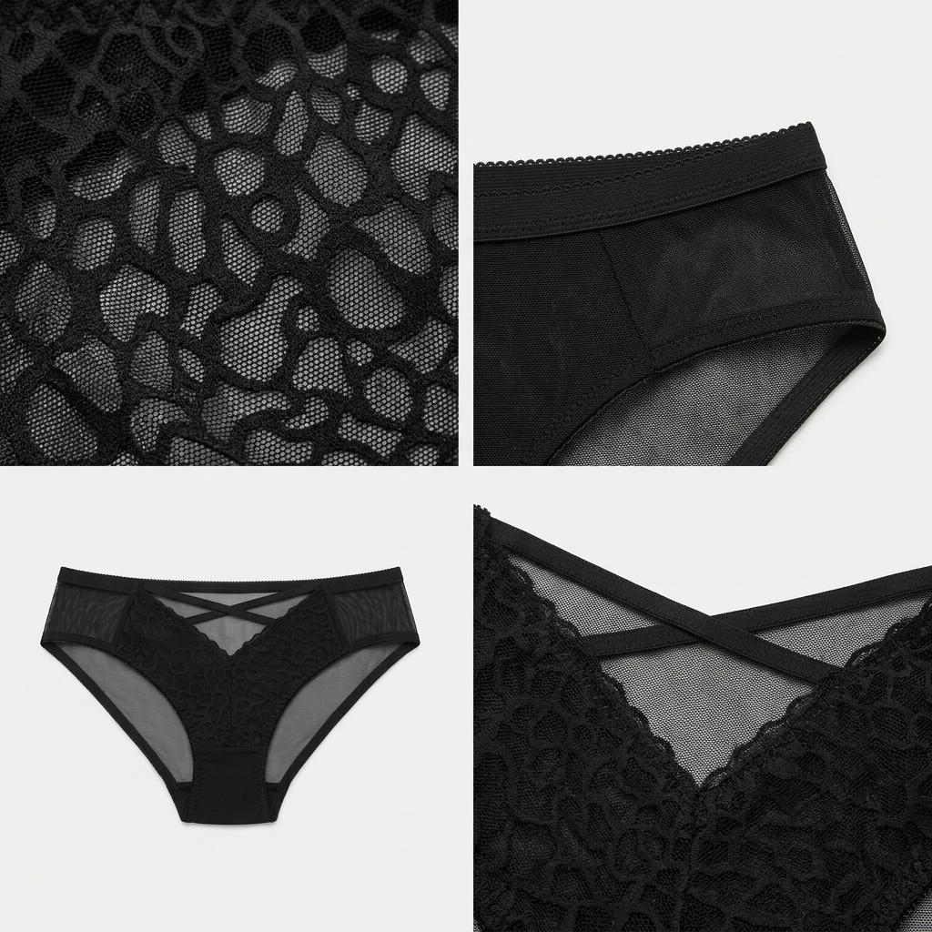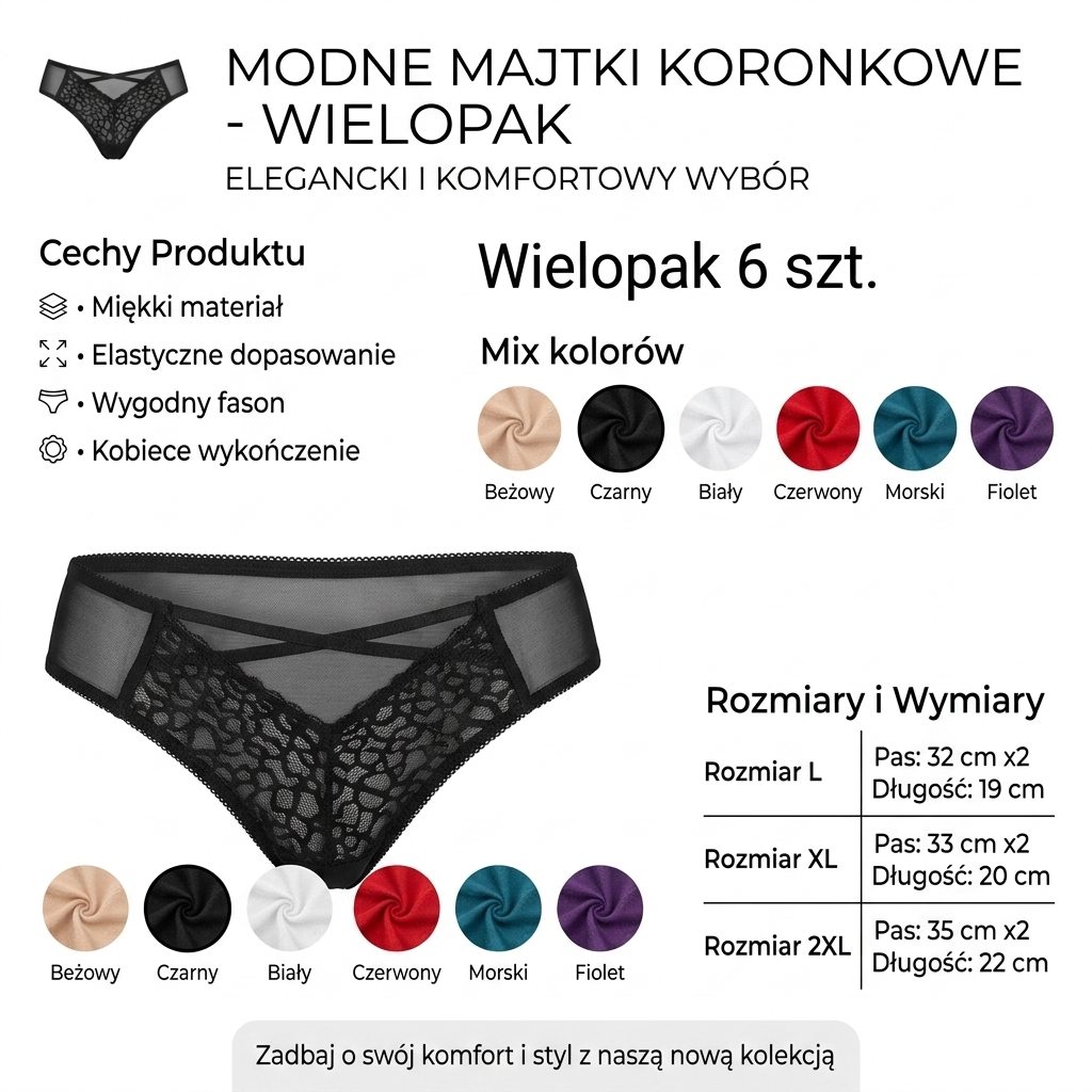 Szukasz bielizny, która wygląda lekko, kobieco i nowocześnie? Ten zestaw 6 damskich majtek z siateczki to propozycja dla kobiet, które chcą połączyć wygodę noszenia z estetycznym, bardziej zmysłowym wykończeniem. Delikatna transparentna siateczka, subtelny wzór i ozdobne detale sprawiają, że model prezentuje się wyjątkowo kobieco, a jednocześnie pozostaje komfortowy w codziennym noszeniu.