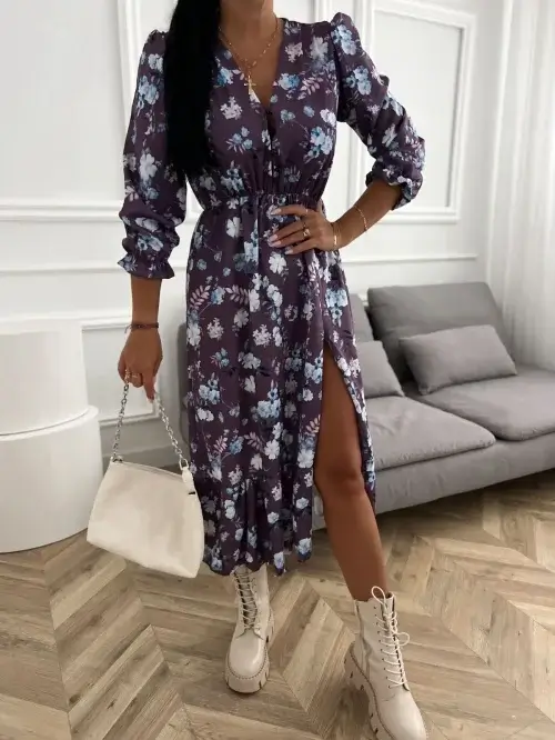 Kobieca sukienka midi w śliwkowym kolorze z kwiatowym printem, która pięknie podkreśla talię i nogi dzięki rozcięciu z przodu. Sprawdzi się na co dzień, do pracy, na randkę czy rodzinne spotkania – wystarczy zmienić buty i dodatki.