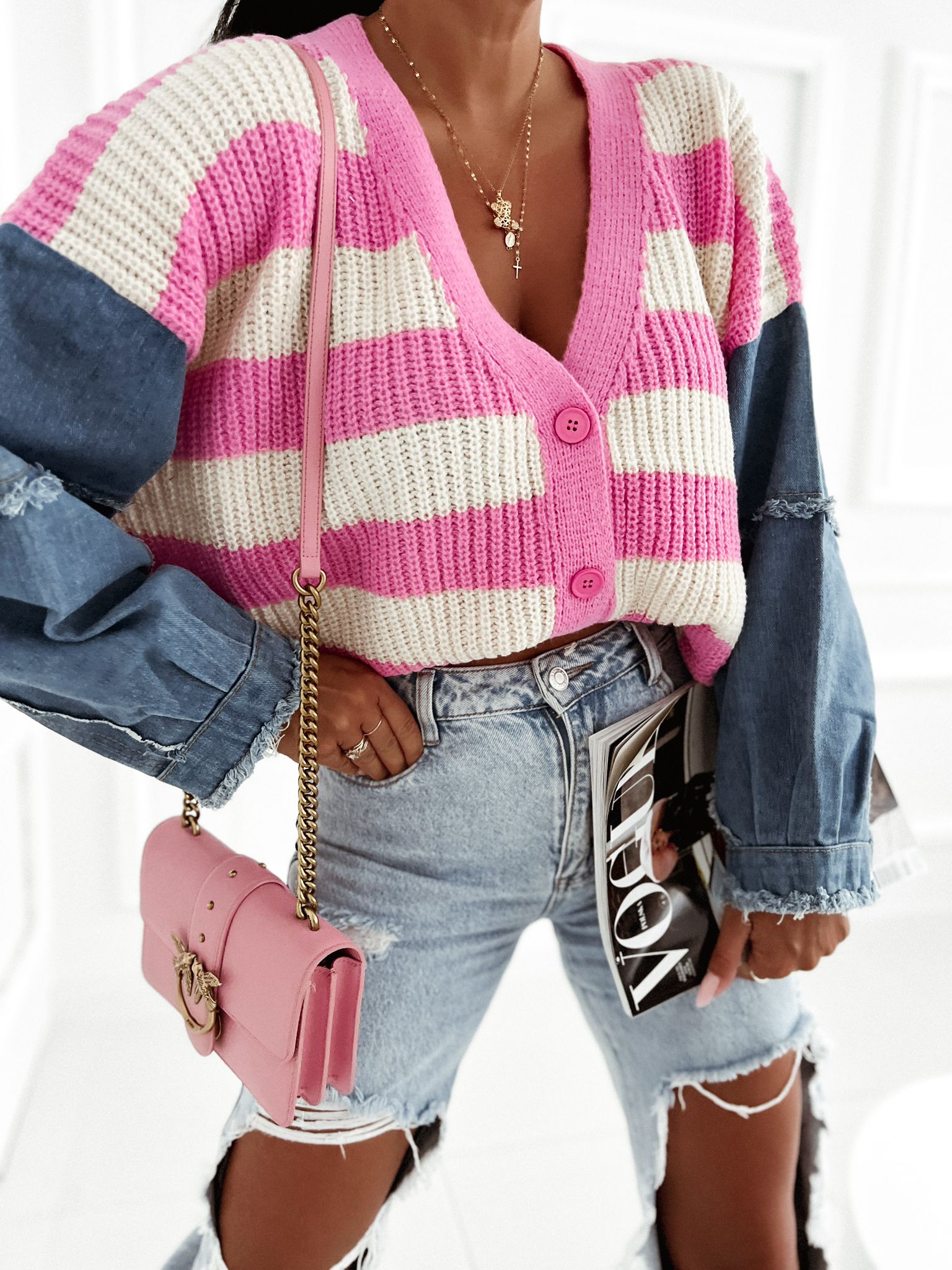 Sweterek damski w rozmiarze uniwersalnym, z modnym wzorem w paski. Model zapinany na guziki z ozdobnymi jeansowymi rękawami. Szerszy fason z dekoltem w serek idealnie skomponuje się z jeansami. Produkt dostępny w kilku wersjach kolorystycznych.